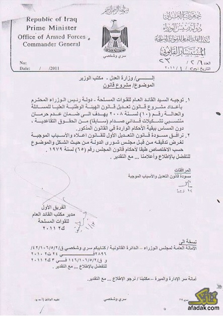 وكان رئيس مجلس الوزراء نوري المالكي كشف، الجمعة،( ١٢ نيسان ٢٠١٣)، أنه وافق على التعديلات في قانون المساءلة والعدالة التي تعيد بعض البعثيين إلى الخدمة وتمنح حق التقاعد لعشرات فدائيي صدام "من دون قراءة حتى ولو كلمة واحدة منها"،