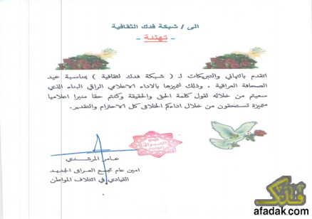 "اتقدم بالتهاني والتبريكات لـ(شبكة فدكـ الثقافية) بمناسبة عيد الصحافة العراقية ، وذلك لتميزها بالاداء الاعلامي الراقي البناء الذي سعيتم من خلاله لقول كلمة الحق والحقيقة وكنتم حقا منبرا اعلاميا متميزا تستحقون من خلال اداءكم كل الاحترام والتقدير .