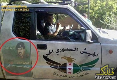 برزت في مواقع التواصل الاجتماعي صورا لجمعات الجيش الحر السوري وهي تضع صورة للمقبور صدام حسين على واجهات عجلاتهم واصفة اياه بانه زعيم العرب ، وعلق متابعون على الصورة بان هؤلاء الذين تدعمهم امريكا التي اسقطت نظام صدام حسين عام ٢٠٠٣ تعني أن أمريكا دولة تحكمها عصابات من الصهاينة , التي تحركها المصالح الحيوية فقط ... بمعنى أنه ليس هناك صديق ثابت أو عدو ثابت ,لكن هناك مصالح ثابتة ؟؟!!