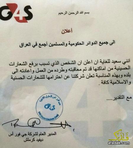 وقال بيان اصدره مدير الشركة ديفيد كرملش ،وتلقت "شبكة فدكـ" نسخة منه انه"تمت معاقبة الشخص الذي تسبب برفع الشعارات الحسينية من اماكنها وقد تم طرده من العمل واعادته الى بلده ".