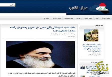 ونشر موقع عراق القانون التابع لرئيس ائتلاف دولة القانون بيان نسب الى مكتب المرجع الاعلى ينفي صدور اي تصريح بخصوص رفضه حكومة المالكي والاسد,
