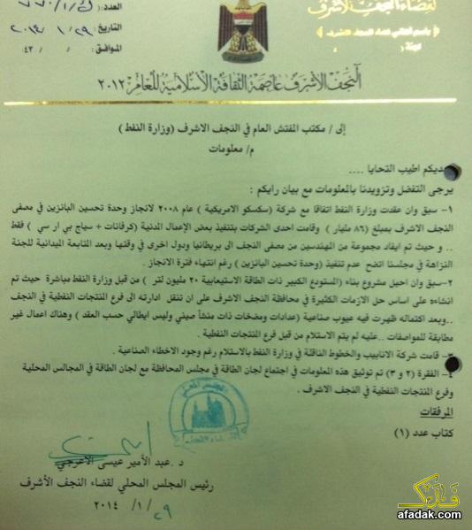 واشار الاعرجي الى ان " شركة الانابيب والخطوط الناقلة في وزارة النفط قامت بالاستلام رغم وجود الاخطاء الصناعية "، لافتا الى انه " في الفقرة {٢،٣} تم توثيق هذه المعلومات في اجتماع لجان الطاقة في مجلس الطاقة بمجلس المحافظة مع لجان الطاقة في المجالس المحلية وفرع المنتجات النفطية في النجف الاشرف".