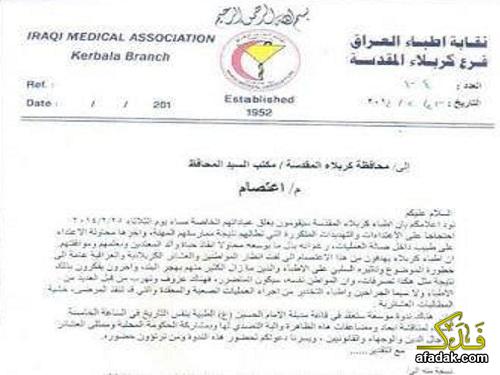 وذكر بيان ،وتلقت "شبكة فدكـ" ،" نود اعلامكم بان اطباء كربلاء المقدسة سيقومون بغلق عياداتهم الخاصة مساء هذا يوم الثلاثاء ٢٥/٢/٢٠١٤ احتجاجا على الاعتداءات و التهديدات المتكررة التي تطالهم نتيجة ممارسة المهنة واخرها محاولة الاعتداء على احد الاطباء داخل صالة العمليات ".
