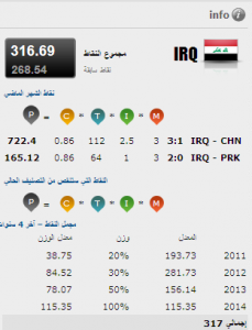 وتقدم العراق ١١ مركزا عن ترتيبه خلال الشهر الماضي محتلا المركز ١٠٣ بعد ان جمع ٣١٧ نقطة ، وكان لتأهل المنتخب العراقي الاول الى نهائيات اسيا بعد تغلبه على نظيره الصيني وفوز منتخب الشباب تحت سن ٢٢ بكأس اسيا التي اقيمت في سلطنة عمان في اواخر شباط الماضي .