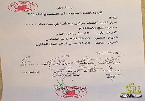 ان " نتائج الاستبيان اعلنت الاحد في مؤتمر صحفي ، حيث كانت اللجنة المنظمة قد وزعت ٣ آلاف استمارة في كافة اقضية ونواحي المحافظة ، وتم افراغ وتدوين البيانات واعلانها خلال اسبوع واحد ، مشيرا الى ان الاستبانة قسمت في ظل تقييم اداء المحافظ صادق مدلول السلطاني ورئيس المجلس رعد الجبوري ، وافضل ثلاثة اعضاء بالمجلس وثلاثة برلمانيين وتقييم اداء مديري الدوائر الخدمية في المحافظة "