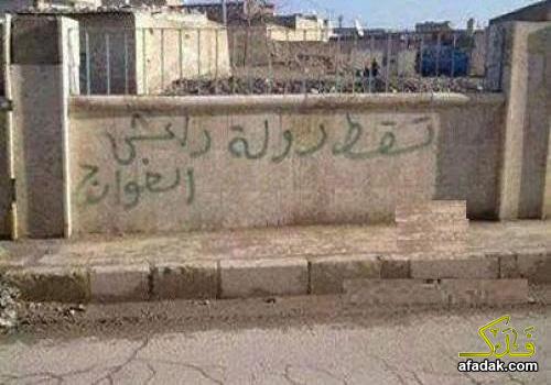 وقال مصدر مطلع ان "شعارات رافضة للتنظيم ومتوعدة اياه بالرد القاسي والانتقام خُطت باللون الاسود على جدران الابنية في حي الفلاح شرقي الموصل, "موضحا ان" حالة من الذعر اصابت عناصر التنظيم ما دفع به لتشديد اجراءاته الامنية في مناطق المدينة كافة".