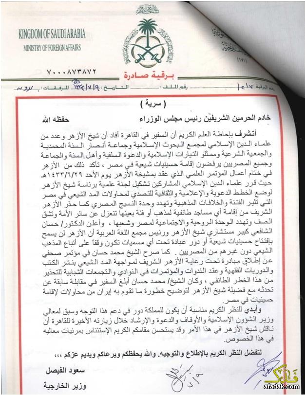 ففي برقية بتاريخ ٩ رجب ١٤٣٣هـ (٣٠ مايو ٢٠١٢م)، معنونة بكلمة "سرية"، بعث وزير الخارجية السابق سعود الفيصل إلى رئيس الوزراء السعودي تقريرًا عن النشاطات التي يقوم بها السفير السعودي في القاهرة لتنسيق جهود ما أسماه "التصدي لمحاولات المد الشيعي في مصر".