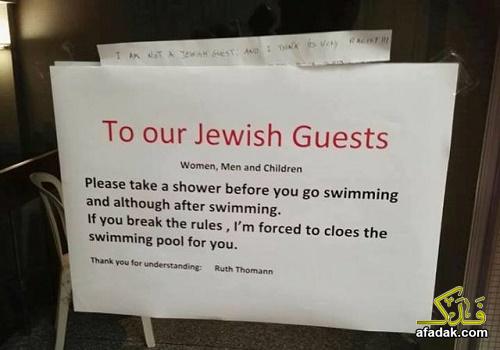 وكتب لافتة علقت عند مدخل حمام السباحة، "إلى ضيوفنا اليهود من الرجال والنساء والأطفال، الرجاء الاستحمام قبل السباحة، وفي حال خالفتم الإرشادات سنكون مضطرين إلى منعكم من استخدام حمام السباحة".
