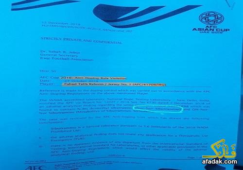 وذكر الاسيوي في كتابه المرسل عن استخدام مادة “سيبوترامين“ للتنحيف، وهي حبوب ممنوعة رياضيا وتؤثر على صحة القلب، وثبت تناولها للحارس من خلال العينة التي اخذت منه بعد مباراة نهائي كاس الاتحاد الآسيوي والتي أقيمت في البصرة.