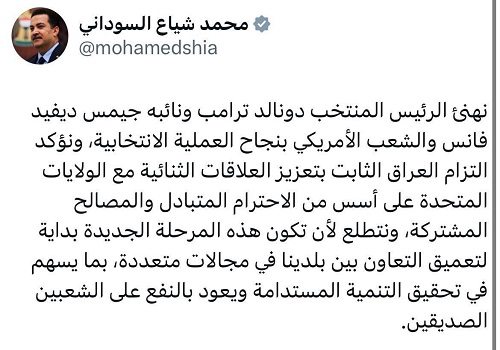 وكتب السوداني في تدوينة على حسابه في منصّة "إكس" وتابعتها "شبكة فدك الثقافية"، "نهنئ الرئيس المنتخب دونالد ترامب ونائبه جيمس ديفيد فانس والشعب الأمريكي بنجاح العملية الانتخابية، ونؤكد التزام العراق الثابت بتعزيز العلاقات الثنائية مع الولايات المتحدة على أسس من الاحترام المتبادل والمصالح المشتركة".