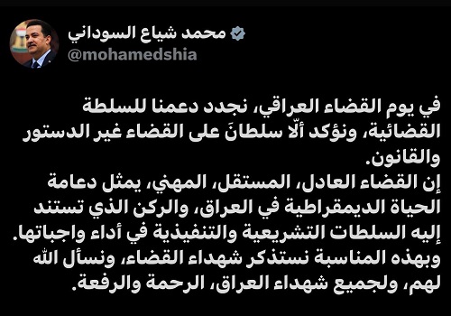 وقال رئيس الوزراء ،في تغريدة له على منصة "اكس"، أنه "في يوم القضاء العراقي، نجدد دعمنا للسلطة القضائية، ونؤكد ألّا سلطانَ على القضاء غير الدستور والقانون".