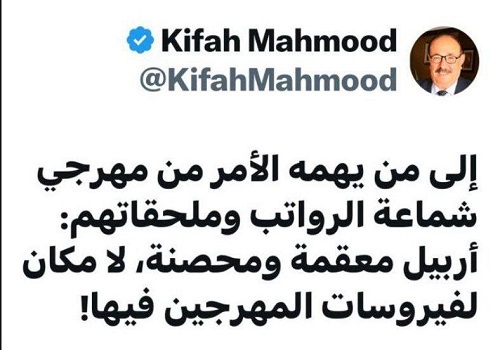 وقال محمود في تغريدة له، تابعتها "شبكة فدك الثقافية"، أنه "إلى من يهمه الأمر من مهرجي شماعة الرواتب وملحقاتهم، (أربيل معقمة ومحصنة، لا مكان لفيروسات المهرجين فيها!)".