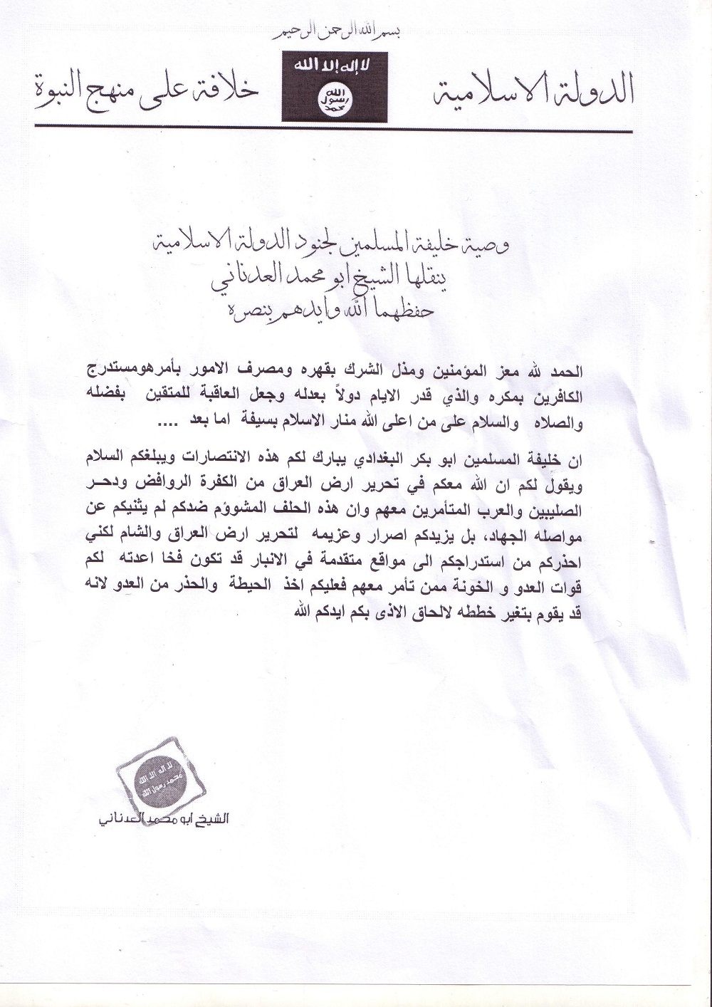 وقال البغدادي في رسالة تم تداولها بين مسلحي التنظيم " ان خليفة المسلمين ابو بكر البغدادي يبارك لكم هذه الانتصارات ويبلغكم السلام ، ويقول لكم ان الله معكم في تحرير ارض العراق من الكفرة الروافض ودحر الصليبين والعرب المتأمرين معهم ، وان هذه الحلف المشوؤم ضدكم لم يثنيكم عن مواصله الجهاد، بل يزيدكم اصرار وعزيمة لتحرير ارض العراق والشام ، لكني احذركم من استدراجكم الى مواقع متقدمة في الانبار قد تكون فخا اعدته لكم قوات العدو و الخونة ممن تأمر معهم فعليكم اخذ الحيطة والحذر من العدو لانه قد يقوم بتغير خططه لالحاق الاذى بكم ايدكم الله بنصره .