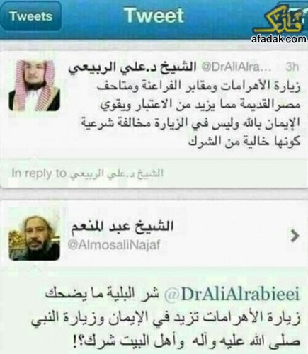يا أمة ضحكت من جهلها الأمم: زيارة الأهرامات وهي قبور مما يقوي الإيمان، وزيارة أهل البيت حرام وشرك..!