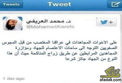 وقال العريفى، عبر حسابه الشخصي بموقع التواصل الاجتماعي "تويتر"،"على الاخوات المجاهدات في عراقنا المغتصب من قبل المجوس الصفوين التوجه الى ساحات الاعتصام للجهاد ومؤازرة المجاهدين المرابطين عن طريق زواج المناكحة حيث ان هذا النوع من الجهاد جائز شرعا ".[بحسب قوله]