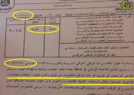 والتي تشير بوضوح الى أن تنظيم القاعدة ينوي تنفيذ عمليات أرهابية يستهدف بها سجني ابي غريب والتاجي، وبالكيفية التي حصلت بالضبط..!