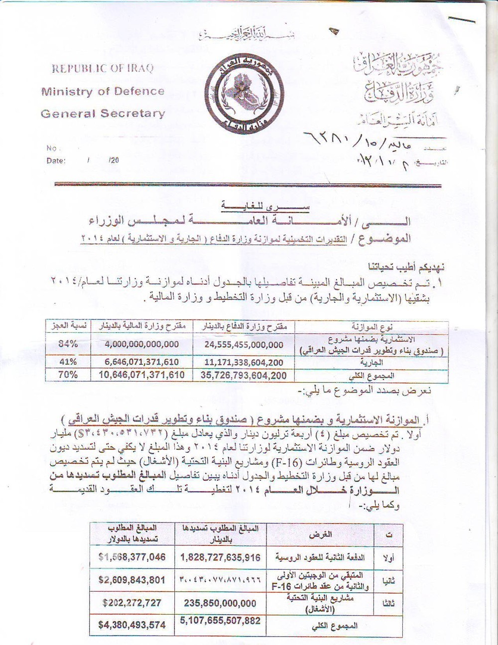 ويذكر التقرير ان "وزارة الدفاع مطالبة في عام ٢٠١٤ بدفع ٥.١ ترليون دينار عراقي، ٤.٣ مليار دولار، والتي تتضمن الدفعة الثانية للعقود الروسية، البالغة ١.٨ ترليون دينار، والمتبقي من الوجبتين الاولى والثانية من عقد طائرات F١٦، البالغة ٣ ترليون دينار، ومشاريع البنى التحتية (الاشغال)، والبالغة ٢٣٥ مليار دينار".