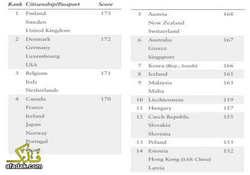 وفي العام الماضي، حصلت كل من الدنمارك، ألمانيا، لوكسمبورغ والولايات المتحدة على الترتيب الثاني، حيث يسافر حاملو جوازاتها إلى ١٧٢ من أصل ١٧٣ دولة، ومن الجدير ذكره، أن جواز السفر الإسرائيلي يأتي في المرتبة الـ٢٠ حيث يتمتع حاملوه من الدخول إلى ١٤٤ دولة من دون تأشيرة.ونصيب الدول العربية كالجزائر، مصر، الأردن، اليمن ليبيا، سوريا، لبنان، قلسطين والعراق لا يتعدى الربع الأخير من القائمة الطويلة بين جوازات سفر دول العالم الأخرى.