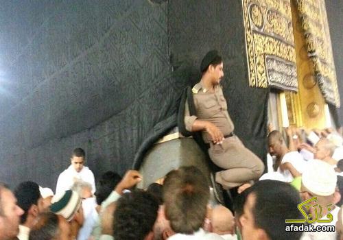 صورة تبين مدى استهتار وحماقة احد جنود ال سعود وهو متكأ بحذائه على جدار الكعبة المشرفة , لتثير مشاعر الالم والحزن للتطاولات المستمرة من ال سعود ومرتزقته فمن هدم الاضرحة والمقامات المقدسة الى تغيير المعالم وتشويهها جاءنا هذا الجندي الوضيع ليدنس هذا المكن المقدس .