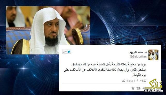 وكتب الدريهم في "تغريدته" قائلا، إن "يزيد بن معاوية بفعلته القبيحة بأهل المدينة عليه من الله ما يستحق يستحق اللعن، وأن يجعل لعنه سنة تأخذها الأخلاف عن الأسلاف، حتى يوم القيامة".