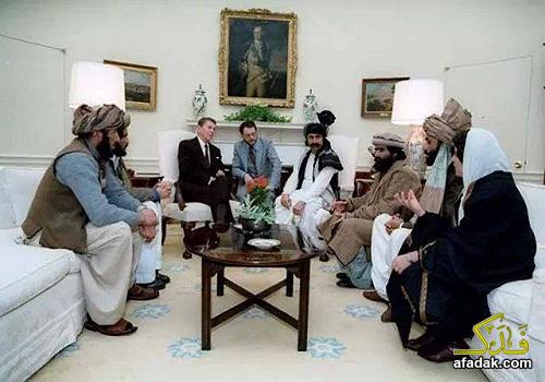ننشر صورة ارشيفية للنواة الاولى من تنظيم القاعدة في لقاء مع الرئيس ريغان عام ١٩٨٤ .