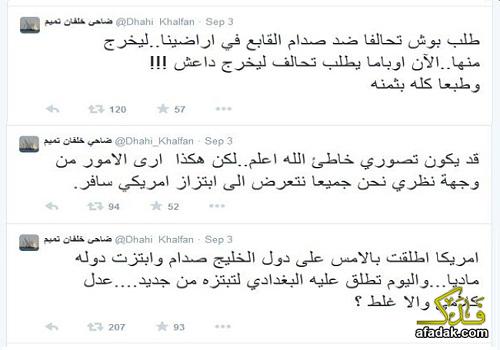 وتابع: ان أوباما يكرر نفس المسلسل الذي اتبعه بوش عندما طلب تحالفا ضد صدام، فأوباما يطلب الآن من دول مجلس التعاون تحالفا ضد داعش، مؤكدا أن هذا كله بثمنه.