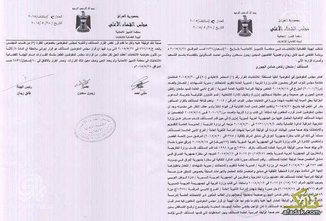 وكانت رئاسة مجلس النواب العراقي قررت خلال الجلسة الـ٤١ من الفصل التشريعي الثاني للسنة التشريعية الاولى التي عقدت، اول امس الثلاثاء،( ٢٦ ايار ٢٠١٥)، الغاء عضوية النائب عن محافظة صلاح الدين مشعان الجبوري لعدم امتلاكه وثيقة دراسية.
