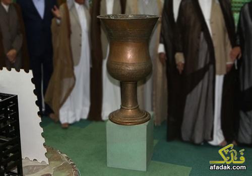 واضاف "ستعرض هذه التحفة الفنية التي هي إحدى الهدايا المقدمة إلى العتبة الحسينية المقدسة عام {١٢٨٥ هـ} من قبل أحد ملوك الدولة الصفوية في العهد القاجاري، عثر عليها مجموعة من شيوخ العشائر وتجار المقتنيات {الأنتيكات} في بغداد واعادوها الى مرقد الامام الحسين{ع}"، مبينا ان " القطعة الاثرية الحضارية سرقت بداية التسعينات ابان الانتفاضة الشعبانية من قبل ازلام النظام المقبور ولمتحف الامام الحسين واخيه ابي الفضل العباس {عليهما السلام} قطع مشابها ومعروضة في متحفيهما، موضحا ان القطة تحمل قرائن عديدة تؤكد عاديتها الى العتبات المقدسة، موضحا ان القطعة كانت تستخدم في السابق لتقديم العصائر للزائرين في المواكب الحسينية في زيارات عاشوراء والاربعينية".