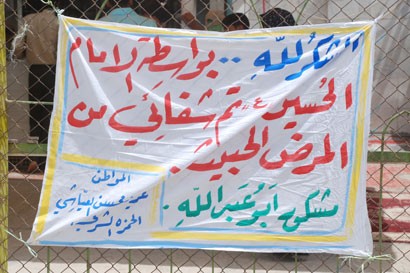 وقام العياشي بتعليق يافطة عند مدخل احدى الابواب الخاصة للحرم الحسيني عبر فيها عن فرحته وشكره لله تعالى لشفائه من المرض بواسطة الدعاء عند قبر الامام الحسين عليه السلام "