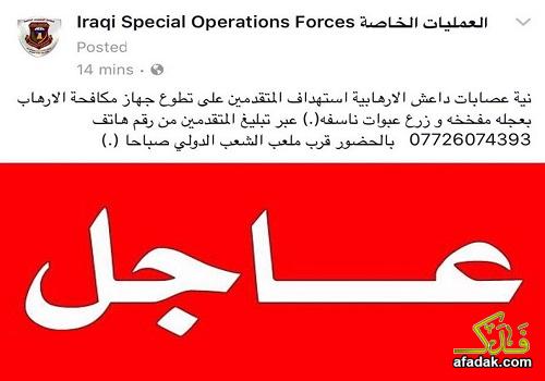 وكتب الجهاز على صفحة " العمليات الخاصة "موثقة" تحذيراً تابعته "شبكة فدكـ" يقول "نية عصابات داعش الارهابية استهداف المتقدمين على تطوع جهاز مكافحة الارهاب بعجله مفخخة و زرع عبوات ناسفه، عبر تبليغ المتقدمين من رقم هاتف ٠٧٧٢٦٠٧٤٣٩٣ بالحضور قرب ملعب الشعب الدولي صباحا".