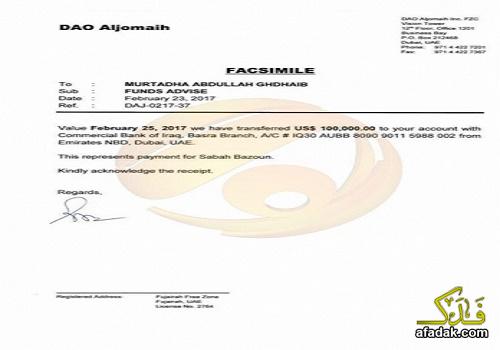 واظهرت الوثيقة تحويل مبلغ مالي بـ ١٠٠ الف دولار من {مرتضى عبد الله } الى مصرف التجاري العراقي فرع البصرة وتمثل كدفعة الى صباح البزوني .