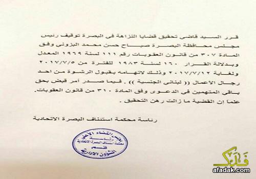 واشارت الوثيقة الى ان " البزوني متهم بقبول الرشوة من احد رجال الاعمال {لبناني الجنسية} ، فيما صدر أمر قبض بحق باقي المتهمين في الدعوى وفق المادة ٣١٠ من قانون العقوبات وان القضية رهن التحقيق".