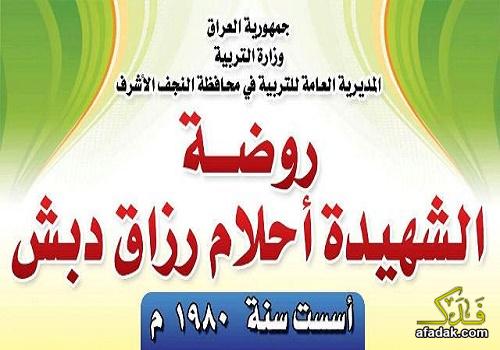 ولفتت الى أن "المدير العام لتربية النجف اياد امين وجه كتابا بتغير اسم الروضة من روضة الجنائن الى روضة الشهيدة احلام رزاق دبش، اكراما لهذه المربية الفاضلة التي طالتها يد الغدر والخيانة مثمنا دور المربي وتضحياته الجسام في بقاء اسم المعلم والتعليم عاليا".