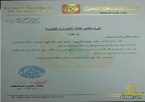 وذكر القرار الموجه الى مكتب الكتلة في البصرة، انه "نظرا لمخالفة الاعضاء (محمد مهدي المنصوري) و(بشرى حميد) التوجيهات المركزية الصادرة من الهيأة السياسية وعدم التزامهم واحترامهم القرارات الصادرة منها تقرر تجميد عضويتهم".