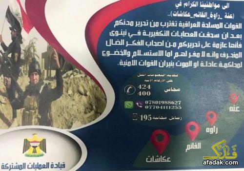 وقالت الخلية في بيان تلقت "شبكة فدكـ" نسخة منه، "ألقت طائرات القوة الجوية، مساء أمس، آلاف المنشورات على مناطق عكاشات وعنة وراوة والقائم غرب الانبار تتضمن توجيهات للأهالي تعلمهم بان ساعة خلاصهم باتت قريبة بعد تحرير نينوى الحبيبة".