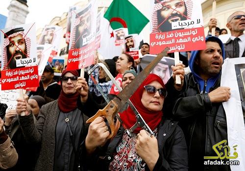 ورفع مئات المحتجين الذي تجمعوا بشارع الحبيب بورقيبة الرئيسي بالعاصمة تونس شعارات ضد زيارة الأمير محمد.