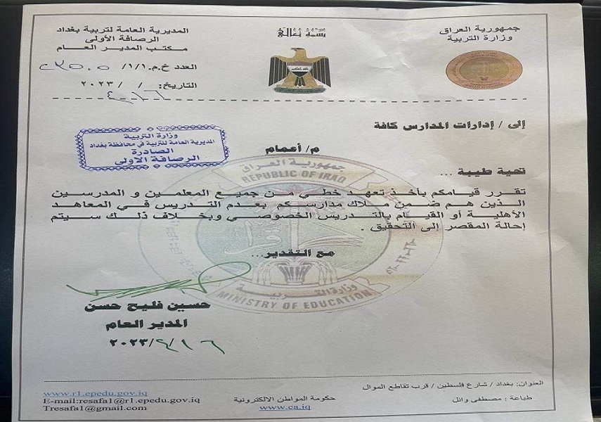 بالوثيقة.. تربية الرصافة الاولى تلزم كوادرها بتوقيع تعهد خطي بعدم التدريس في المعاهد والمدارس الاهلية