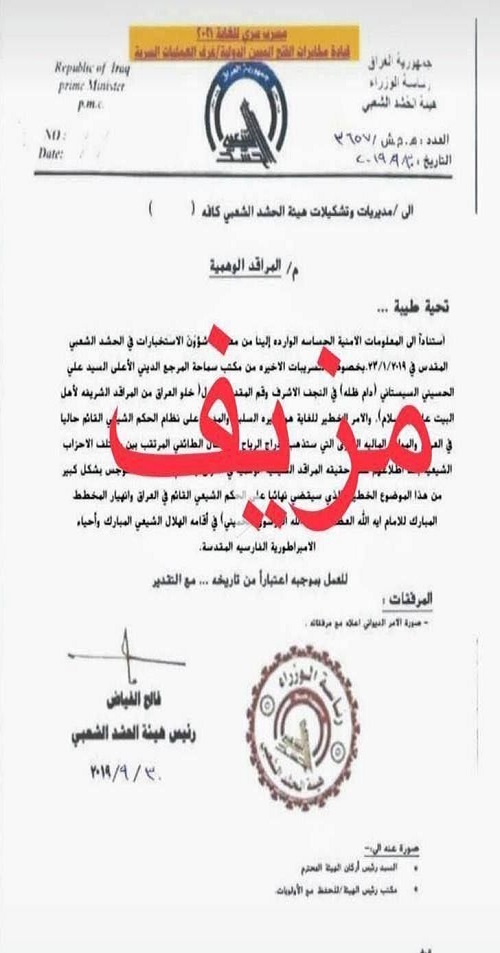 أصدرت هيئة الحشد الشعبي، اليوم الاثنين، تنويهاً تلقته شبكة فدك الثقافية ، بشأن كتاب "مزيف" منسوب إليها. وذكرت الهيئة في بيان، أنه "نود التنويه بأنه لا صحة للكتاب المتداول والذي يحمل تاريخا قديما والمنسوب لهيئة الحشد الشعبي بشان ما يسمى