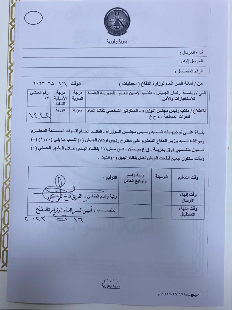 وذكر بيان ورد ل"شبكة فدك"، أن العباسي وافق على إعادة العمل بنظام البديل لجميع الفرق العسكرية تباعا، شريطة مراعاة الحالة الأمنية ضمن قواطع المسؤولية.