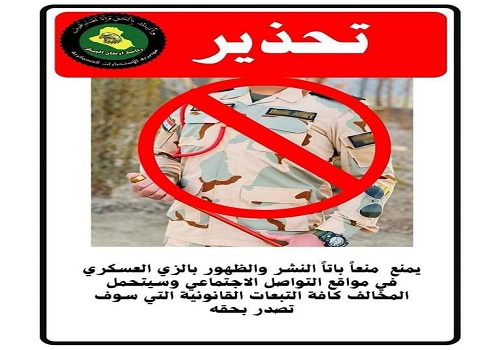 وقالت الوزارة في بيان مقتضب تلقته "شبكة فدك الثقافية"، انه "يمنع منعاً باتاً النشر والظهور بالزي العسكري في مواقع التواصل الاجتماعي وسيتحمل المخالف كافة التبعات القانونية التي سوف تصدر بحقه".