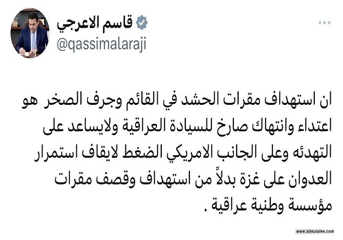 وقال الأعرجي، إن "استهداف مقرات الحشد في القائم وجرف الصخر هو اعتداء وانتهاك صارخ للسيادة العراقية ولا يساعد على التهدئة".