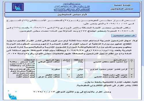 وفي قرار منفصل، منحت المفوضية مرشحين من وزارة الداخلية مهلة ثلاثة أيام لتقديم وثائق رسمية تُثبت انقطاع علاقتهم بالوزارة، أو توضح أسباب العزل أو الطرد المثبتة بحقهم. وأكدت أنه في حال عدم الامتثال خلال المهلة المحددة، فسيتم إلغاء المصادقة على ترشيحهم.