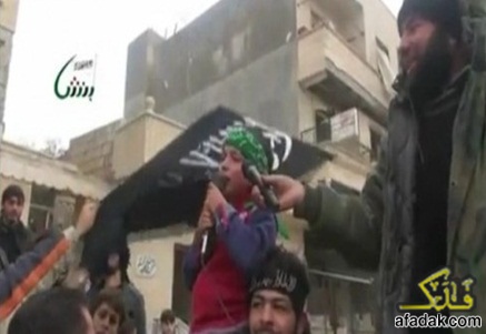 طفل محمول على الأكتاف يلوح بسكينه وينشد أهزوجة تتوعد بذبح الشيعة والنصيريين بالسكاكين في قريتي "كفرية" و"الفوعة" المجاورتين، فيما المئات من الارهابيين الوهابيين يرددون بحماسة وحبور ونشوة عظيمة خلفه كما لو أنه يفجّر مواهبه في الغناء ، بينما يرفرف علم "القاعدة" في طرف الساحة!